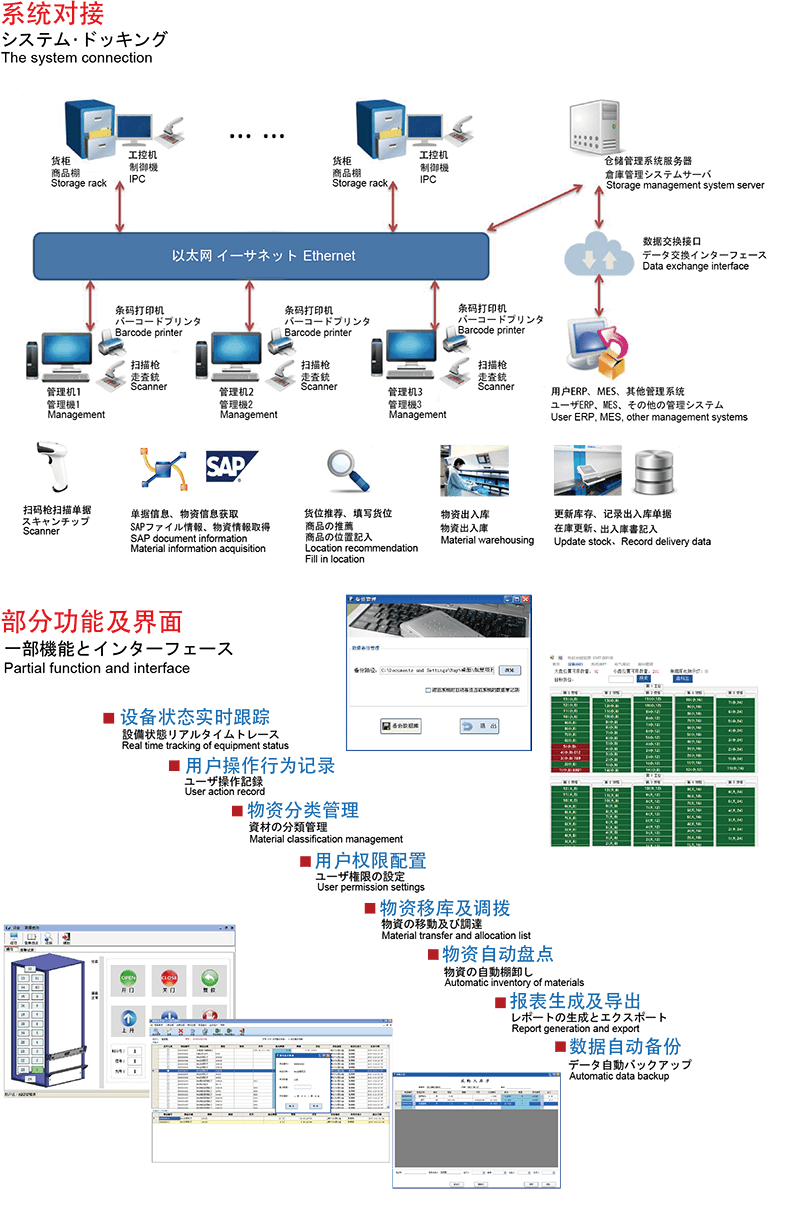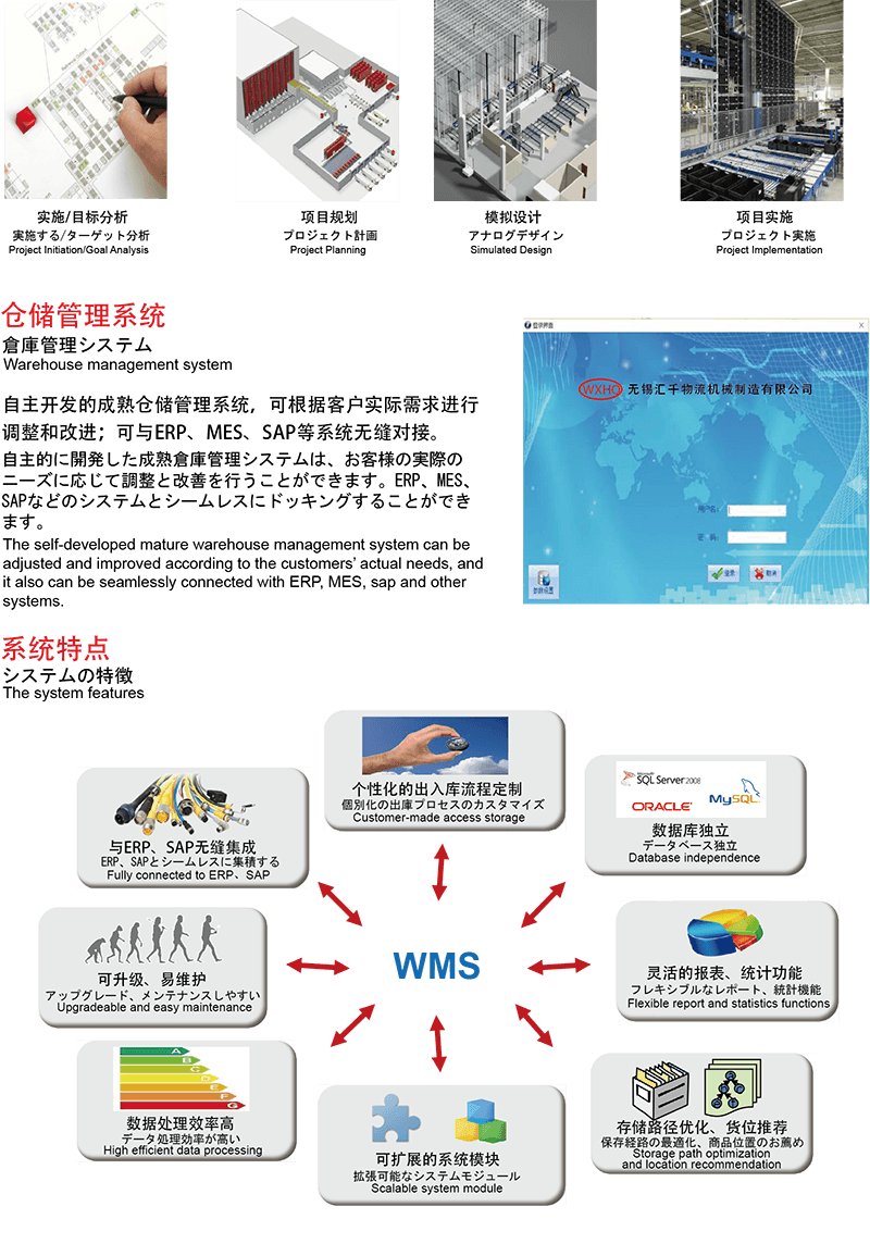 Jádrem těchto řešení je zralý, nezávisle vyvinutý systém řízení skladu (WMS). Tento pokročilý systém je nejen silný při řízení složitosti moderních skladů, ale také flexibilní. Může být upravena a upravena podle specifických požadavků klientů a zajistit, aby podporovala malé operace i rozsáhlé podniky. WMS se bezproblémově integruje s jinými obchodními systémy, jako jsou ERP, MES a SAP, nabízejí podnikům sjednocenou platformu pro správu jejich provozu.
