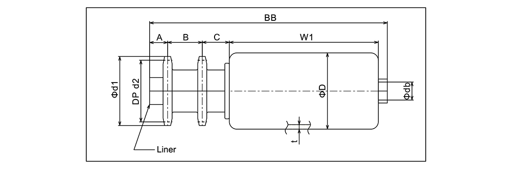 | Typ | Velikost válce | Šířka válce | Válečkový materiál | Ložisko | Průměr hřídele | Velikost vložky | Řetězové kolo | D1 | D2 | A | B | C | W1 | BB |