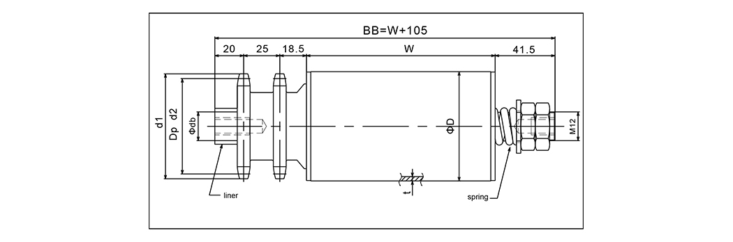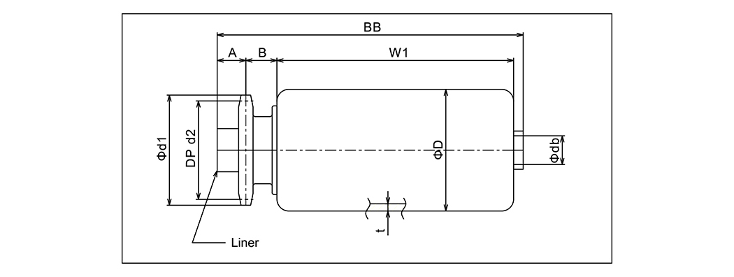 | Typ | Velikost válce | Šířka válce | Válečkový materiál | Ložisko | Průměr hřídele | Velikost vložky | Řetězové kolo | d | D2 | A | B | W1 | BB |
