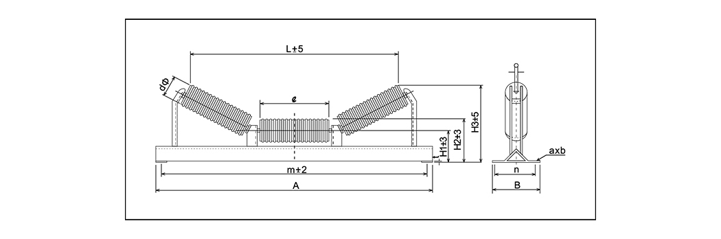 | Model | Šířka pásu | d | e | m | A | H | B | n | Ó | axb |
