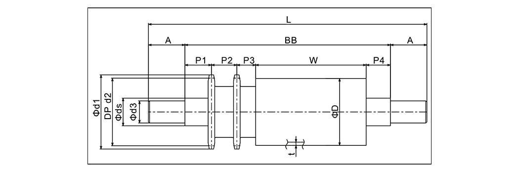 | Typ | Velikost válce | RollerWidth | Roller Matenal | Bearng | Průměr hřídele | Řetězové kolo | D1 | D2 | D3 | A | L | BB | P1 | P2 | P3 | P4 |
