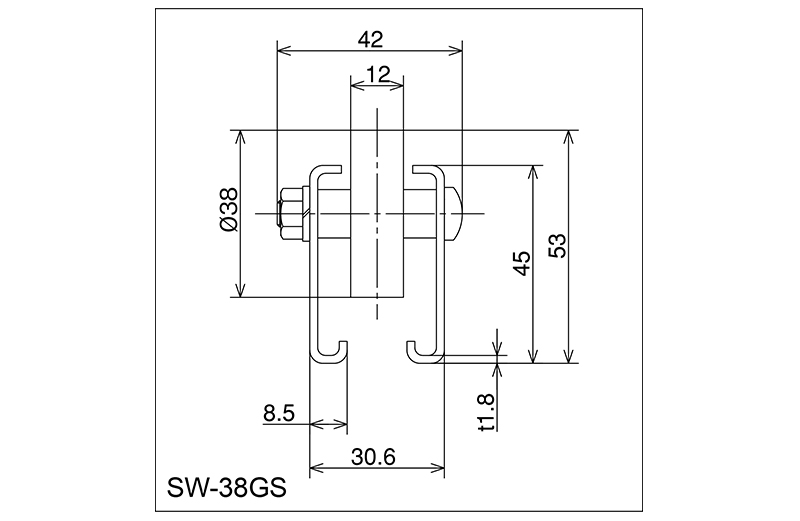 | SW-38GS | 38 × 12 × 6 × 27 | M6 × 38L | 45 × 31 × 8,5 × 42 × 1,8 | 53 | 1800 · 2400 · 3000 | 50 · 75 · 100 · 150 | 30 | POM |